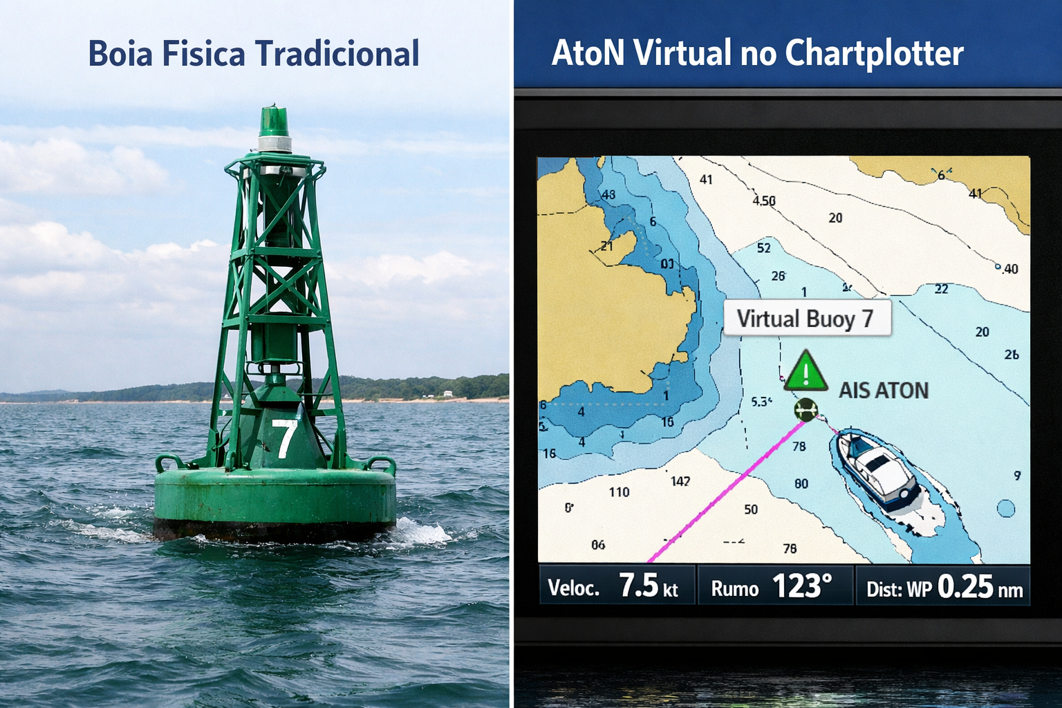Já o AtoN virtual é flexível, rápido de implementar e pode ser ativado, movido ou desativado remotamente conforme a necessidade operacional.